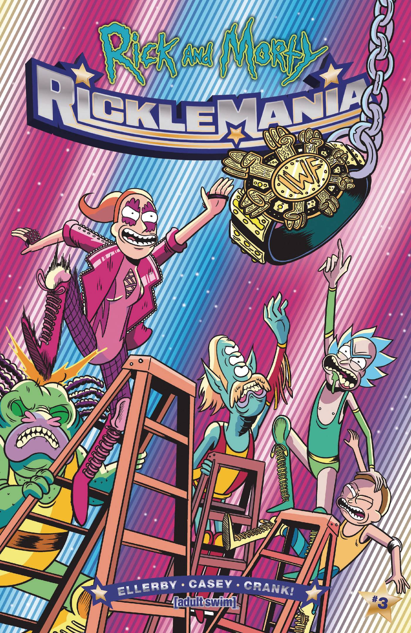 "From Marc Ellerby (Doctor Who), the piledriving action of Rick and Morty: Ricklemania continues as we reach the penultimate issue-and the stakes couldn't be higher!